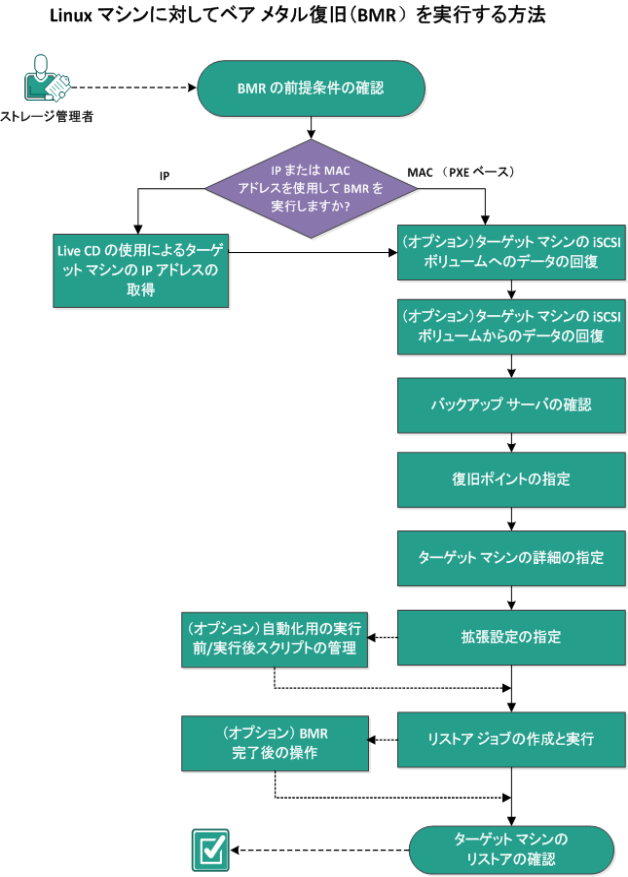BMR はオペレーティング システムとソフトウェア アプリケーションをリストアし、バックアップされたデータをすべて復旧します。BMR はベア メタルからコンピュータ システムをリストアするプロセスです。ベア メタルは、オペレーティング システム、ドライバおよびソフトウェア アプリケーションのないコンピュータのことです。リストアが完了すると、ターゲット マシンはバックアップ ソース ノードと同じ動作環境で自動的に再起動します。また、データがすべてリストアされます。