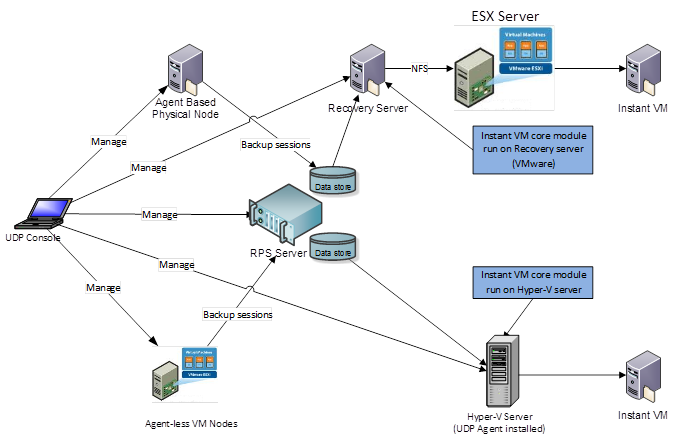 인스턴트 가상 컴퓨터(인스턴트 VM)는 하이퍼바이저에서 가상 컴퓨터를 만들고 사전 변환 없이 가상 컴퓨터 내에서 백업 세션을 실행합니다. 인스턴트 가상 컴퓨터의 이점은 Arcserve UDP 백업 세션에 존재하는 데이터 및 응용 프로그램에 바로 액세스할 수 있다는 점입니다. 인스턴트 VM은 백업 세션의 기존 복원 또는 변환을 물리적 컴퓨터 또는 가상 컴퓨터로 전환하는 데 관련된 가동 중지 시간을 제거합니다.