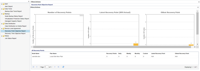 RPO(복구 지점 목표) 보고서는 백업 환경에서 복구 지점의 분산 방식을 보여주는 준수 보고서입니다. 이 보고서는 재해 발생 시 노드를 되돌릴 수 있는 가장 오래된 지점과 가장 새로운 지점을 평가하는 데 도움이 됩니다. RPO 보고서는 백업 대상에 대한 것이므로 백업이 어느 정도 준비되면 보고서가 데이터로 채워집니다. 보고서는 요청 시 새로 고침을 통해 채워지거나 일정에 따라 채워집니다.