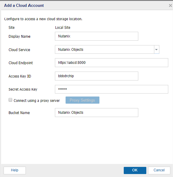 Add an Nutanix Objects cloud account to copy Files or recovery points to cloud storage. You can use this account while creating Copy Recovery Point / File Copy /File Archive task.