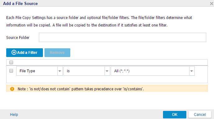 - The filter is added below the Add a Filter button. You can add multiple filters and can also remove the filters. For more information, see Add File Copy Filters.
