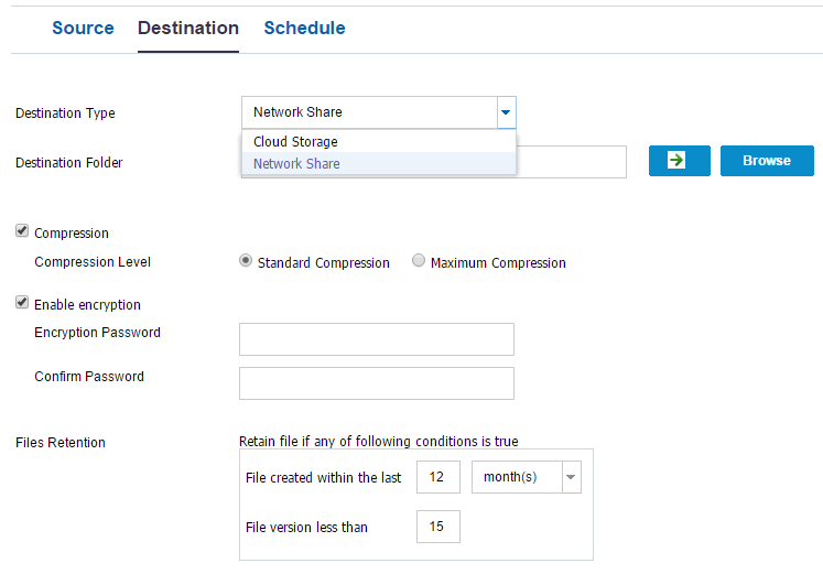 Specifies the destination where the copied files are stored. The destination can be any local volume or folder or a file share accessible by any uniform naming convention (UNC) path. This field is available when you select Network Share as the destination type. You can also browse the destination folder.