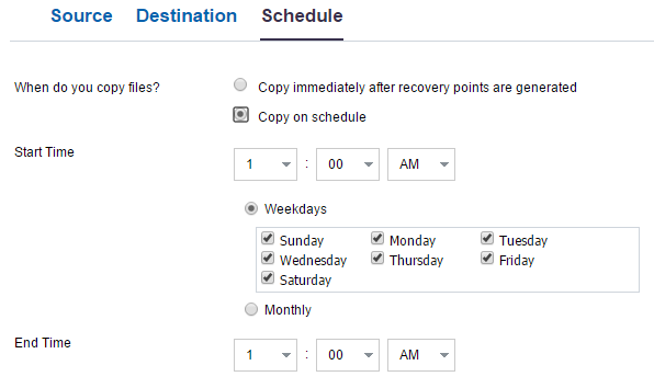 - Click the Schedule tab and specify the file copy schedule.