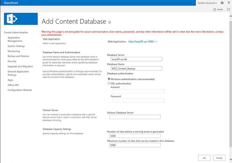 - Type Database Server and Database Name, (for example, WSS_Content_Backup) and then click OK.
