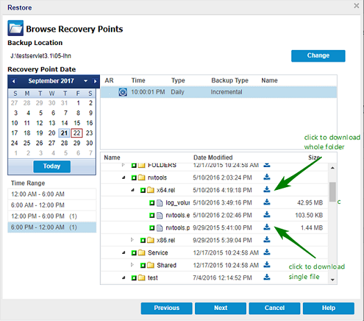 To download, you simply need to reach the Browse Recovery point screen in the Restore wizard. The below screenshot displays how to perform download of a file or folder: