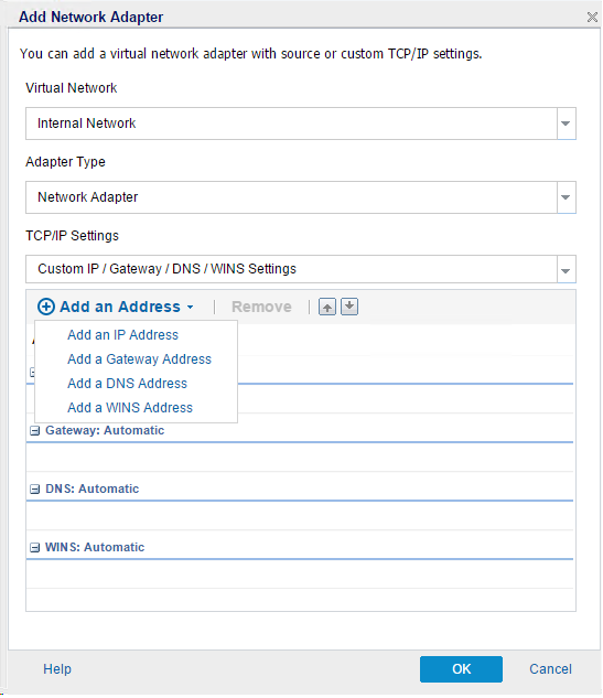 - Specify the Virtual Network, Adapter Type, and TCP/IP Settings. If you want to specify the IP address of the Instant VM, you can click Add an Address and select the address you want to configure.
