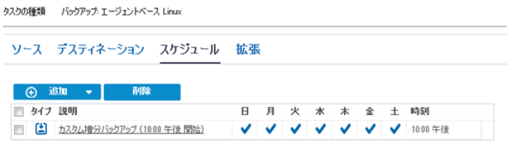 [スケジュール]ページでは、特定の間隔で繰り返されるバックアップ スケジュールを定義できます。スケジュールを定義した後、ジョブはスケジュール通りに自動的に実行されます。複数のスケジュールを追加し、保存設定を提供できます。ローカル ディスクまたは共有フォルダがバックアップ先である場合、デフォルト値は、午後 10 時 00 分に毎回行われるカスタム増分バックアップです。RPS サーバがバックアップ先である場合、デフォルト値は、午後 10 時 00 分に毎回行われる日単位の増分バックアップです。