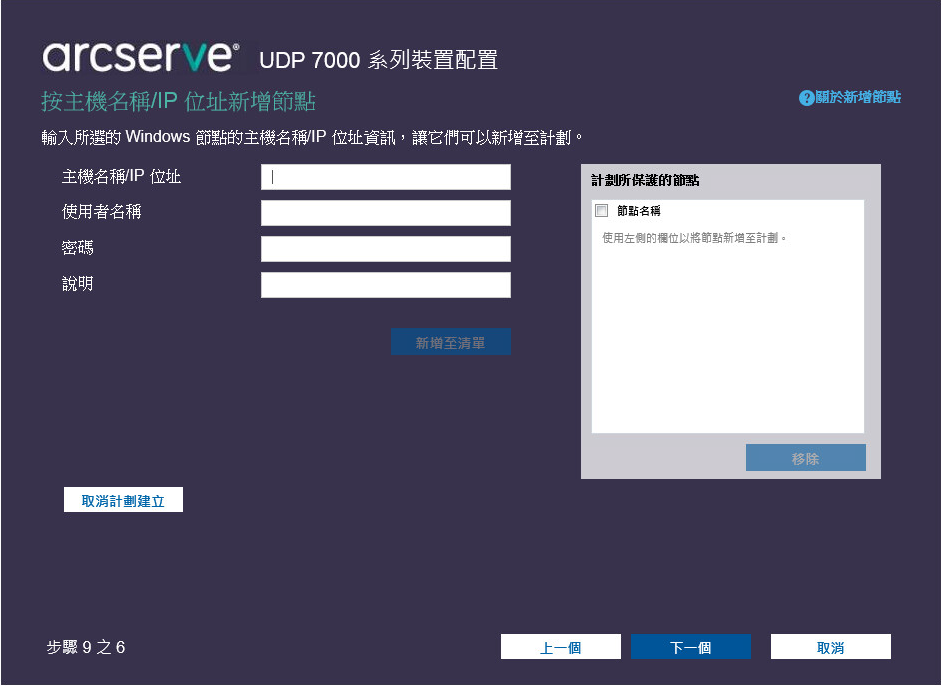 您可以手動輸入 IP 位址或位址的主機名稱,以將節點新增至計劃。當您有幾個要新增的節點時,請使用此方法,不過,您可以一次一個的方式新增多個節點。Arcserve UDP Agent (Windows) 會安裝在這些節點上。