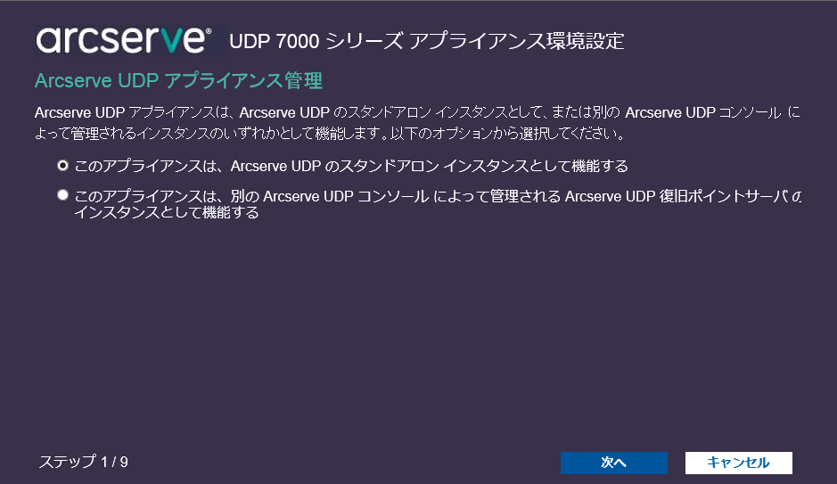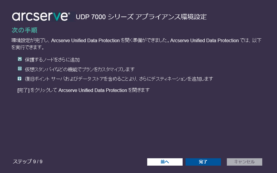 注:[キャンセル]をクリックすると、ウィザードをいつでもキャンセルして Arcserve UDP コンソールを開くことができます。