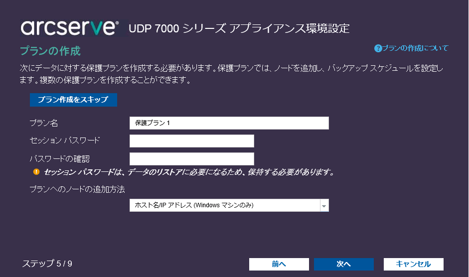 アプライアンスが新しいホスト名で再起動されると、Unified Data Protection ウィザードが表示されます。ウィザードを使用して、バックアップをスケジュールするための基本プランを作成できます。プランでは、保護するノード、バックアップを作成するタイミングを定義できます。バックアップ先は、アプライアンス サーバです。