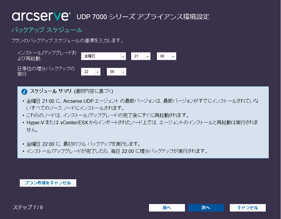 注:インストール/アップグレード時間より前にバックアップ時間を指定すると、バックアップは自動的に次の日にスケジュールされます。たとえば、エージェントのインストールを金曜日の午後 9 時にスケジュールし、バックアップを午後 8 時にスケジュールした場合、バックアップは土曜日の午後 8 時に実行されます。