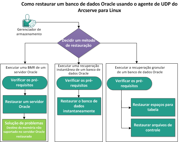 É possível restaurar todo o banco de dados Oracle ou restaurar arquivos específicos do banco de dados. Também é possível executar uma BMR (Bare Metal Recovery – Recuperação Bare Metal) de um Oracle Server quando o servidor de origem não estiver funcionando corretamente. Caso tenha perdido o banco de dados e deseja tê-lo disponível de imediato, é possível executar uma recuperação instantânea. Leia os pré-requisitos para cada tipo de restauração, antes de iniciar o processo de restauração.