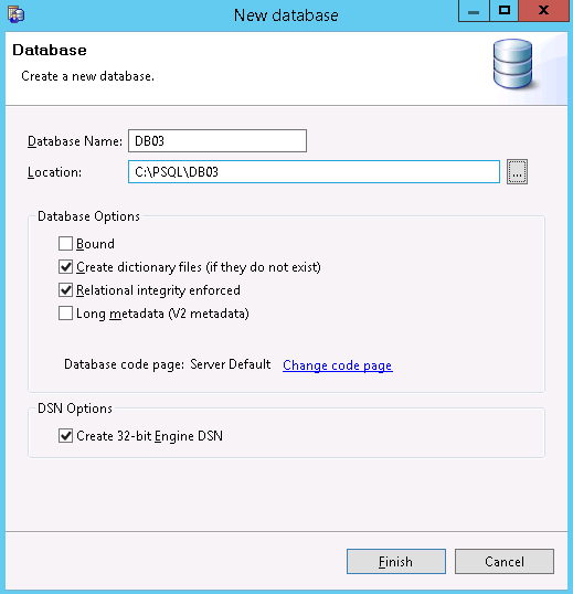- 从“新数据库”对话框,输入以下字段,然后单击“完成”以完成数据库创建。