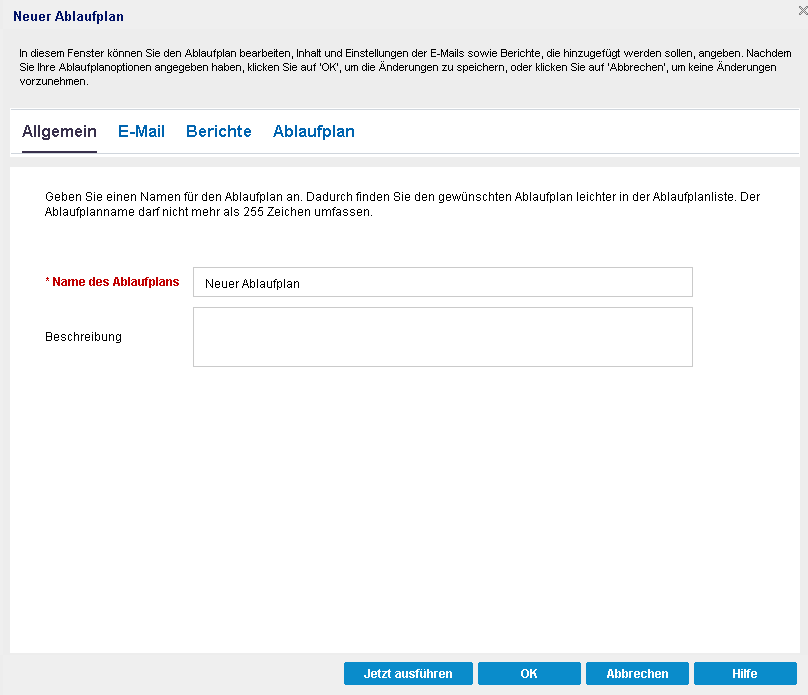 - Allgemein: Geben Sie einen Namen und eine Beschreibung (optional) für den neuen Ablaufplan an.