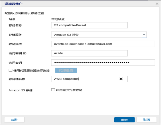 添加 Amazon S3 兼容云帐户以便将文件或恢复点复制到云存储。 在创建“复制恢复点”/“文件复制”/“文件存档”任务时,可以使用此帐户。