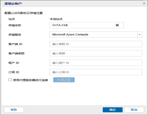 添加 Microsoft Azure Compute 云帐户以便将文件或恢复点复制到云存储。在为“虚拟备机到云”或“Microsoft Azure 上的即时虚拟机”计划创建任务时,可以使用此帐户。