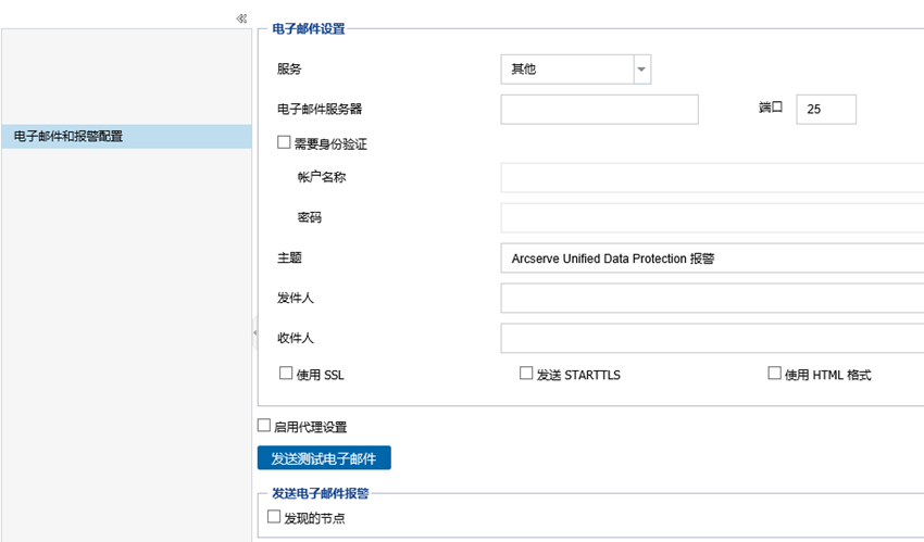 电子邮件和报警配置页面允许您提供电子邮件设置和电子邮件报警配置。