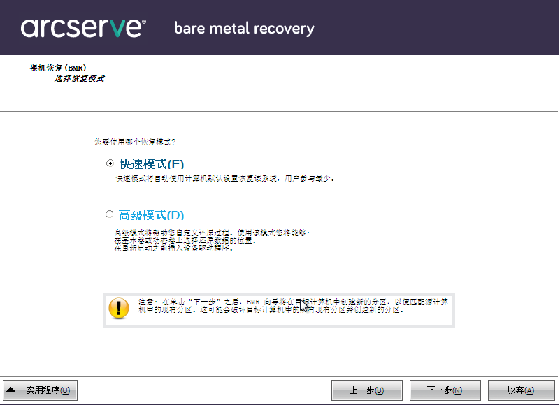 - 如果在恢复过程中要最少的交互,请选择“快速模式”。有关详细信息,请参阅以快速模式执行 BMR。