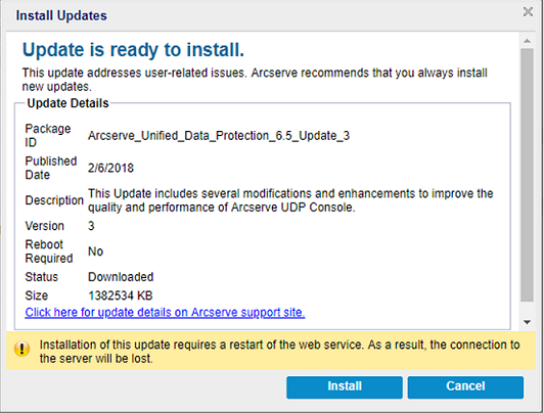 - The Install Updates dialog opens to display information that is related to the available update. The dialog includes information such as description, download status, size, reboot requirement, and a link to the Arcserve server for additional update details.