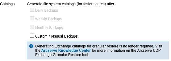 - Catalogs let you generate the File System catalog. The File System catalog is required to perform faster and better search. If you select the catalog check boxes, the catalogs are enabled depending on the type of backup that you have specified. Clear the check box to disable generating the catalog.
