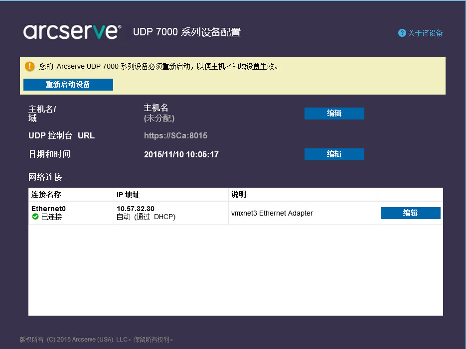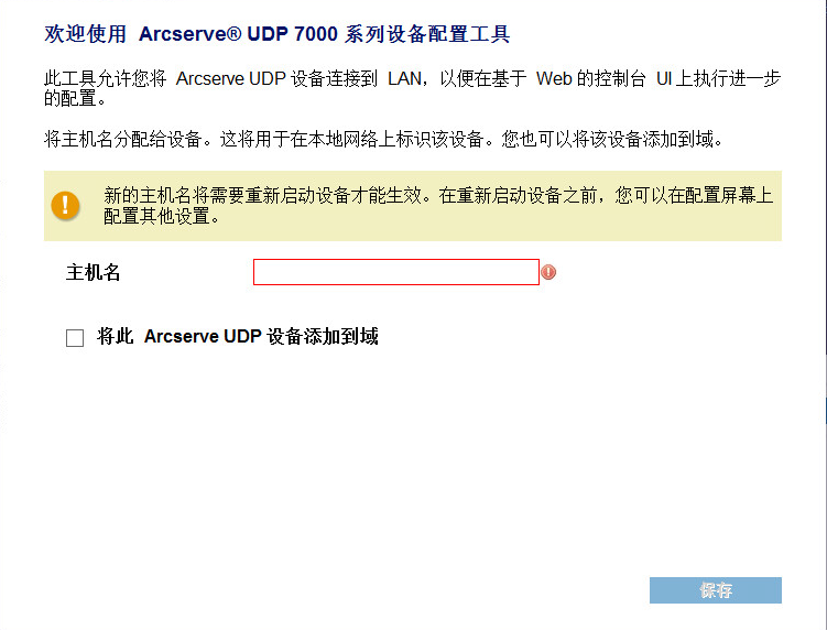 要管理 Arcserve UDP 设备,第一步是将设备联网。为此,您必须为设备指定主机名,然后配置网络端口。