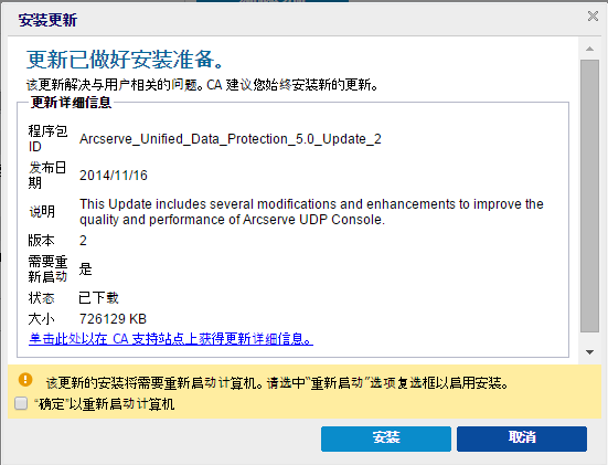 安装更新对话框将打开,显示与可用更新相关的信息。 该对话框包含说明、下载状态、大小、重新启动要求等信息,以及链接到 Arcserve 服务器以获取其他更新详细信息的链接。