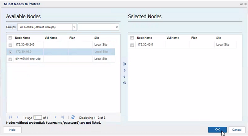 - Opens the Select Nodes to Protect dialog and you can select the nodes from the displayed list. Select this option if you have already added the nodes to the Console.