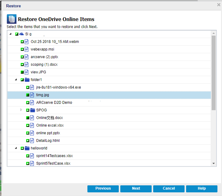 - Se puede seleccionar todo el contenido o el contenido parcial del objeto de OneDrive que se va a restaurar. Para seleccionar parte del contenido, expanda el objeto y haga clic en la casilla de verificación de dicho contenido.