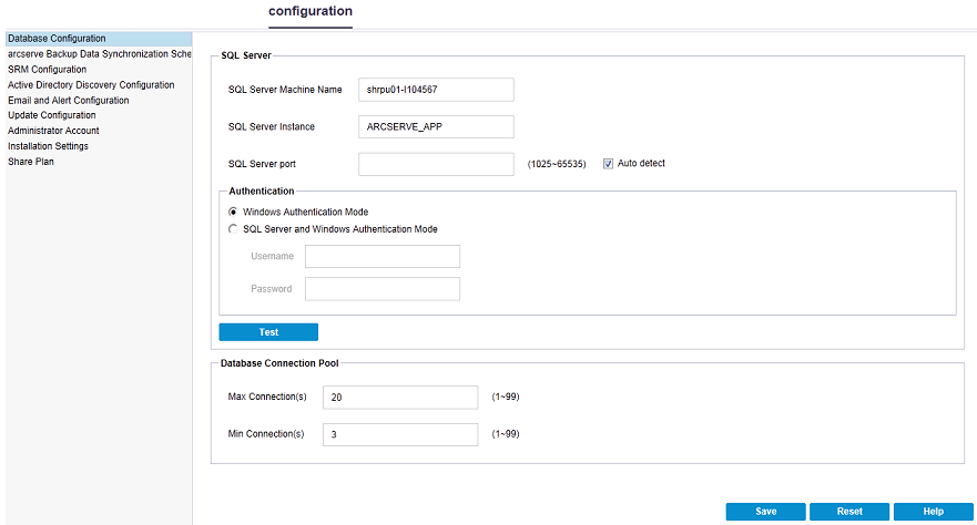 The Database Configuration page lets you enter details about the database. The database configuration requires details about SQL Server, number of connections, and authentication mode.