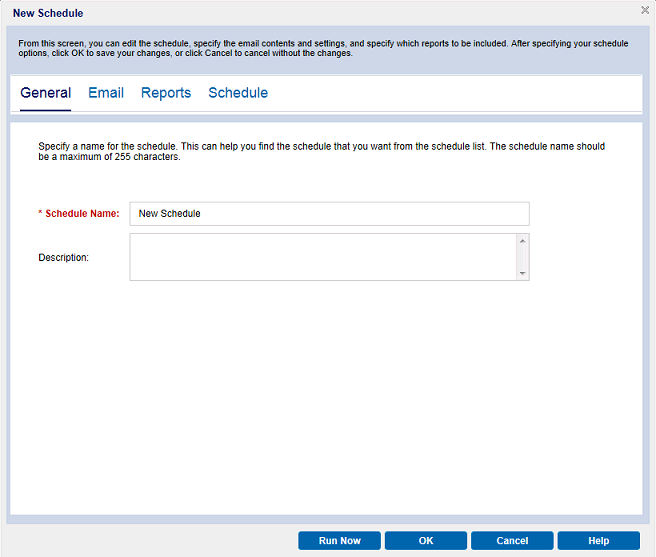 - General: Specify a name and description (optional) for the new schedule.