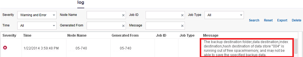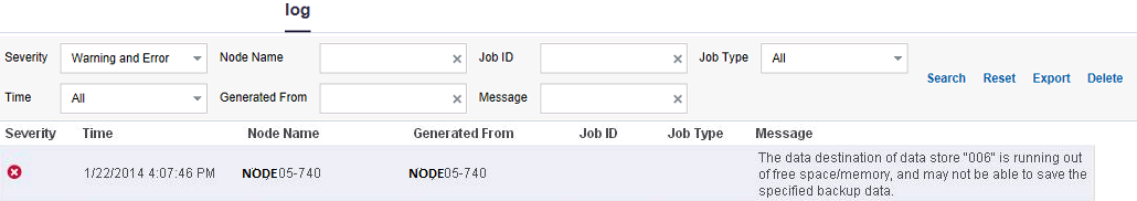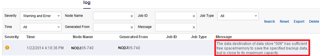 The log tab display errors or warning statuses related to data store threshold. The following diagrams displays the different types of errors or warnings for specific folders: