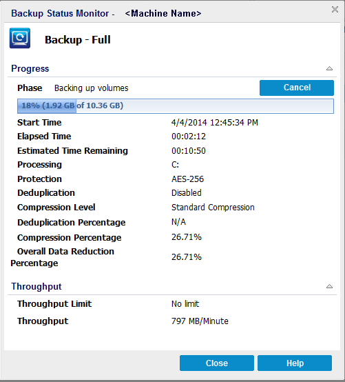 The Job Monitor dialog lets you view the status of a job. When a job is running, this panel expands to display information about the ongoing event such as the estimated time remaining to complete the job, the percentage and size of the job already completed, and the total size of the job when completed.